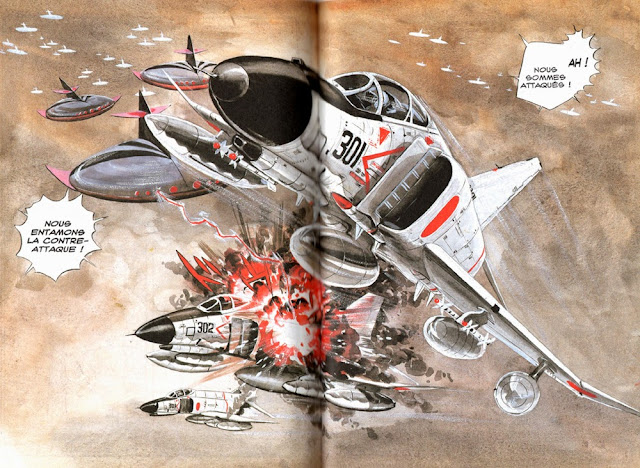 Une tentative de colorisation a été faite sur quelques planches. Toujours étrange cette manie (déjà constatée sur l'édition Deluxe de Saint Seiya) de bâcler la couleur sous prétexte qu'il s'agit d'un manga. A part une double planche magnifique, représentant un combat entre des navettes de Véga et des Phantom japonais (cf. image ci-dessous), tout le reste est immonde et ressemble aux coloriages d'un enfant de quatre ans...